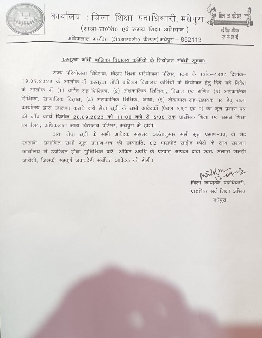 बिहार शिक्षा परियोजना परिषद मधेपुरा के अंतर्गत संचालित कस्तूरबा गांधी बालिका विद्यालय में सामग्रियों के क्रय हेतु निविदा।